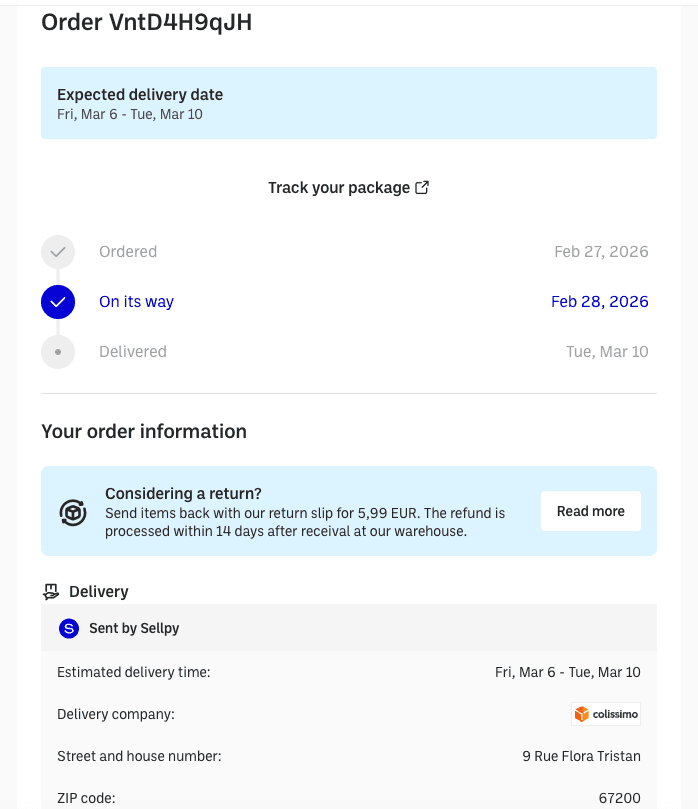 Bạn có thể tạo nhãn vận chuyển trả hàng trực tiếp từ tài khoản Sellpy, in ra và gửi lại.